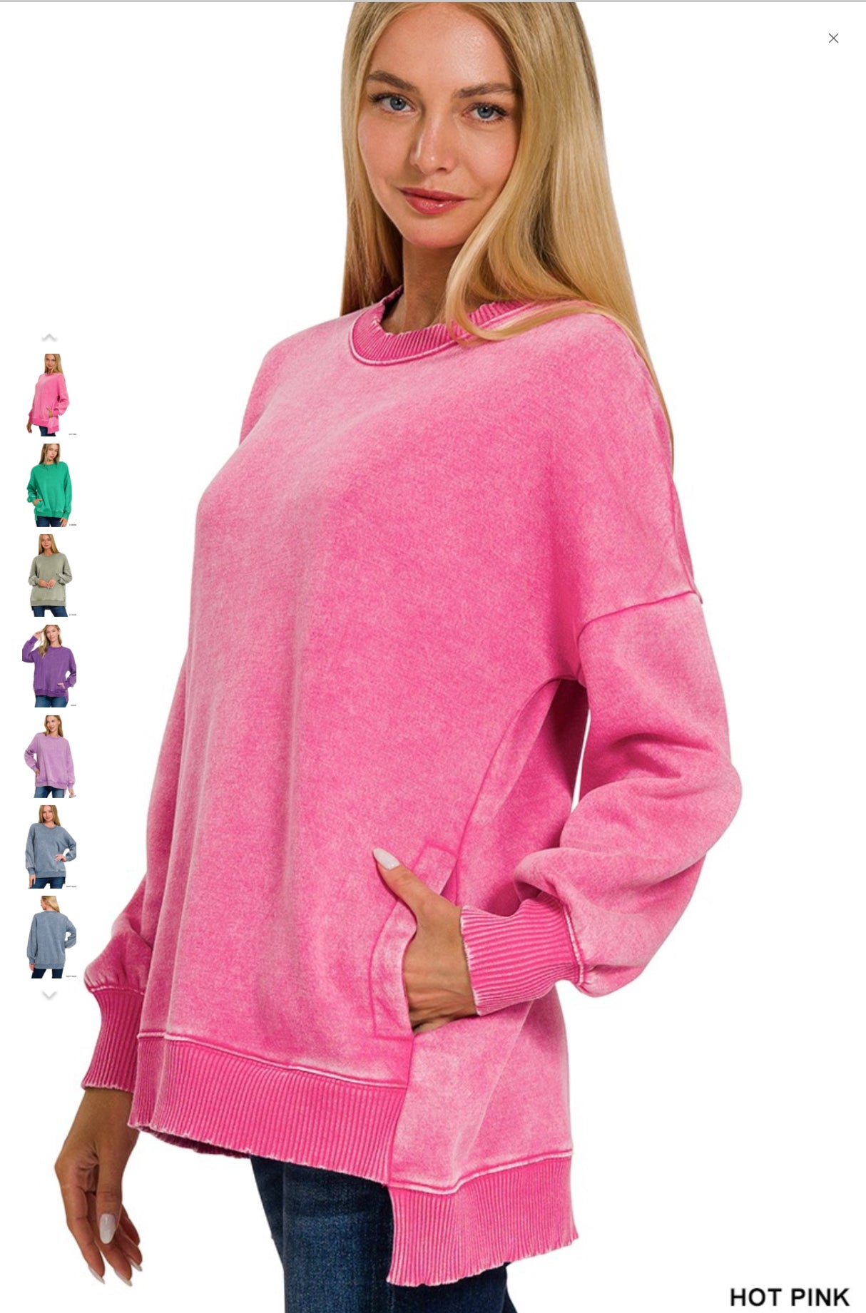 ACID WASH FLEECE HI-LOW HEM PULLOVER WITH POCKETS **Each item is unique, expect variations in color and finishing TOTAL BODY LENGTH: 27"(FRONT), BUST: 45" approx. - MEASURED FROM SMALL - TRIM: 58% COTTON 37% POLYESTER 5% SPANDEX *
